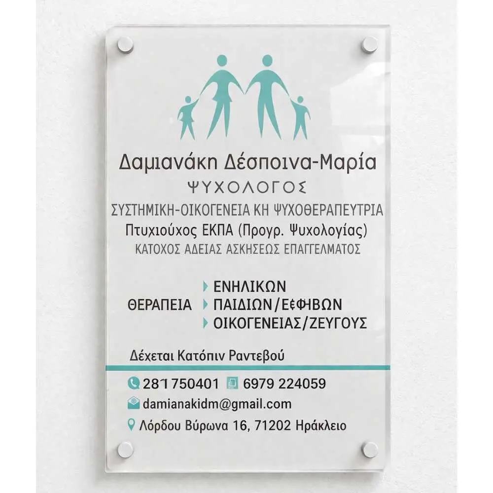 Επιγραφή από άσπρο plexiglass με κολλημένα αυτοκόλλητα γράμματα που συνδυάζει αισθητική και αντοχή.